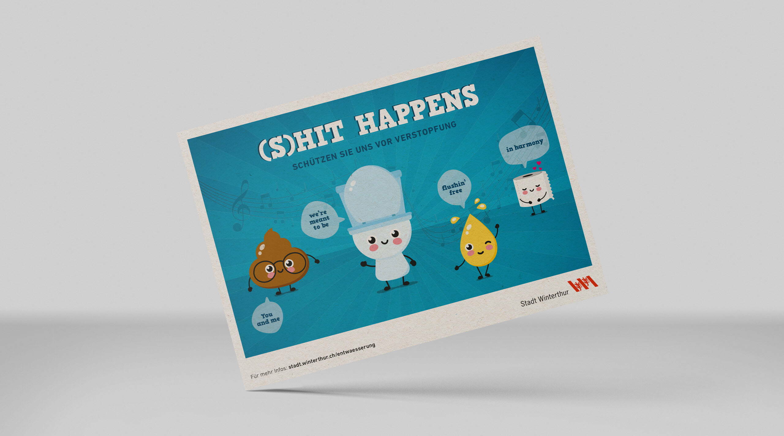 Die liebenswert illustrierten Emojis präsentieren ihre grössten (S)hits wie «Flushin’ free in harmony» oder «Let it pee» auf Plakaten, Flyern und auf den Social-Media-Kanälen der Stadt Winterthur. Heiter und informativ klärt die Kampagne die Winterthurer*innen darüber auf, was ins Klo gehört und was eben nicht.