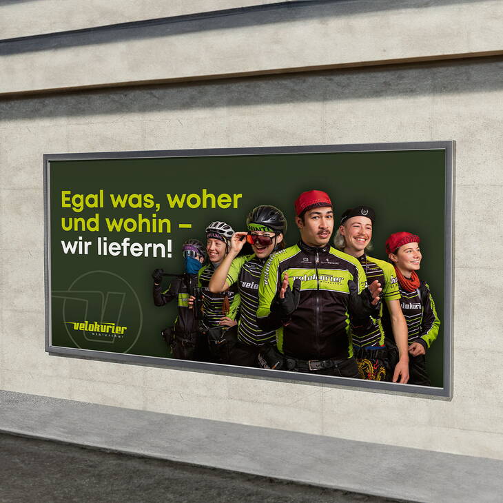 Die Kampagne konzentriert sich auf die Menschen hinter dem Erfolg des Velokuriers. Entstanden sind verschiedene Plakate, die das Team authentisch abbilden und immer eine andere Kurier-Persönlichkeit in den Mittelpunkt stellen. Die unterschiedlichen Personenkonstellationen stehen symbolisch für das Engagement und den unermüdlichen Einsatz des gesamten Teams.